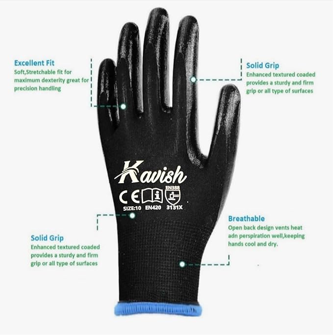 Stay protected and productive with Kavish Blue Nitrile Coated Gloves, engineered for professionals who demand superior grip, durability, and comfort. Made from a high-quality nitrile coating over a flexible nylon shell, these gloves deliver excellent resistance to oil, grease, and abrasion, making them ideal for construction, automotive, mechanical, and industrial applications.